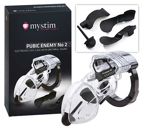 Der Pubic Enemy No 2 ist ein schmucker Peniskäfig mit E-Stim-Funktion und zusätzlicher Silikonspitze zum Einführen: Mit ihm wird ein aufmüpfiger Lümmel eingefangen und weggesperrt, so dass er nicht steif werden kann, bis der- oder diejenige mit dem Schlüssel ihn wieder freilässt. Mit den Leitflächen links und rechts im Käfig kann der Gefangene nach Lust und Laune mit Kribbeln, Zucken oder Pulsieren in genau der Intensität behandelt werden, die er sich verdient hat.